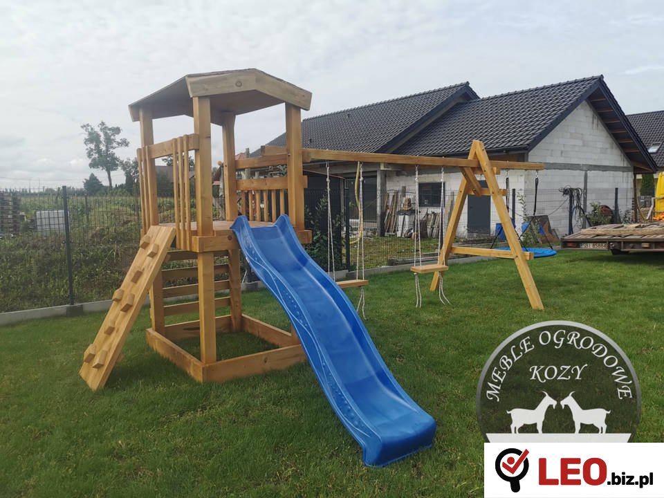 Producent oferuje solidny drewniany plac zabaw wykonany z kantówki.