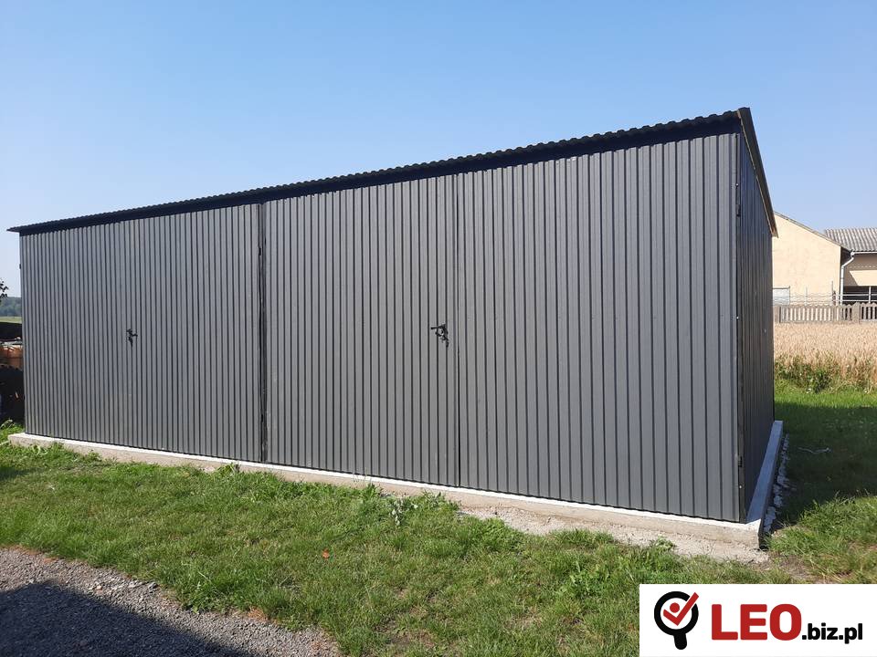 Garażu Blaszanego GRAFITOWEGO Jednospadowego o wymiarach 7x5 , wyposażonego w dwie bramy otwierane na boki /Możliwość zamówienia bramy uchylnej na boki / .