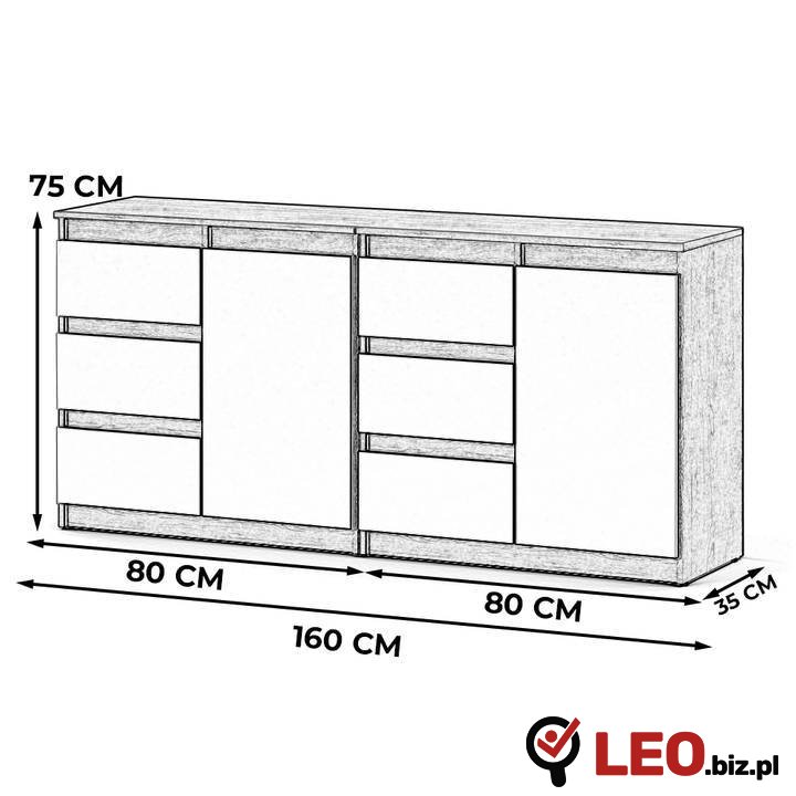 • Funkcjonalna organizacja: 6 pojemnych szuflad oraz 2 drzwiczki skrywające półki pozwalają na wygodne przechowywanie odzieży, dokumentów i innych przedmiotów.