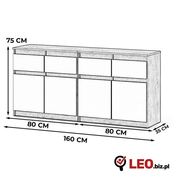 • Przemyślana organizacja: 4 pojemne szuflady oraz 4 drzwiczki z półkami wewnątrz umożliwiają wygodne przechowywanie ubrań, dokumentów lub akcesoriów.