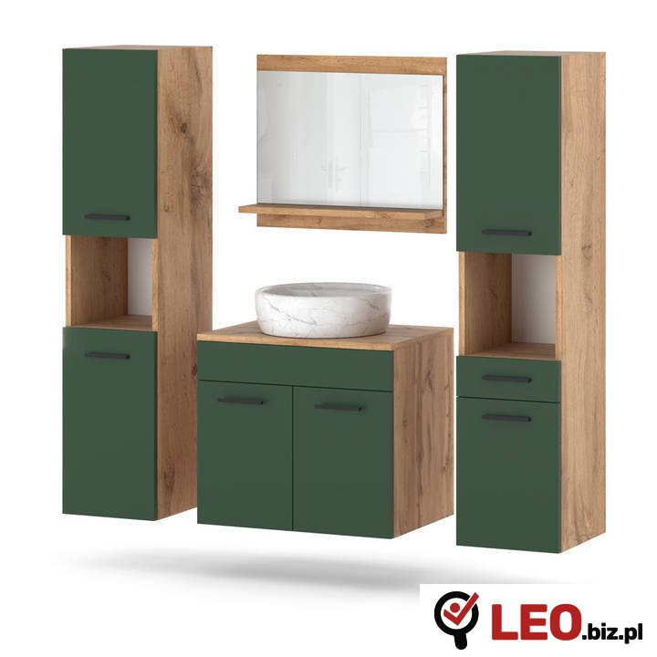 Zestaw Mebli Łazienkowych 120cm Szafka Pod Umywalkę, Lustro Oraz Słupki Wotan Butelkowa Zieleń to elegancki i funkcjonalny zestaw mebli, który sprawdzi się w każdej nowoczesnej łazience. Jego połączenie dąb wotan z frontami w kolorze Butelkowa Zieleń nada Twojej łazience stylowy, ponadczasowy wygląd, który z pewnością przyciągnie wzrok. Zestaw składa się z szafki pod umywalkę z dwoma drzwiczkami, dwóch praktycznych słupków i dużego lustra, co pozwala na maksymalne wykorzystanie przestrzeni.