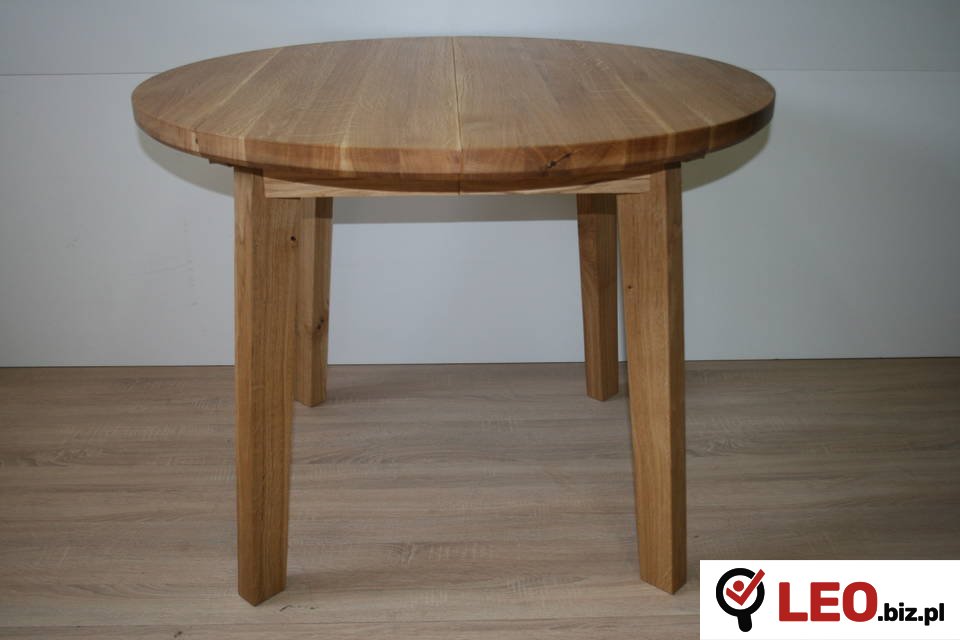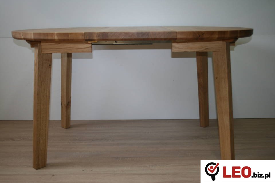 Przedmiotem sprzedaży jest okrągły stół z litego drewna dębowego o grubości 4 cm. Wymiary prezentowanego blatu stołu wynoszą 90 cm z jedną wkładką o szerokości 50 cm .