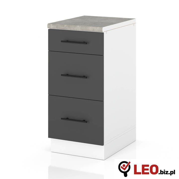 Szafka Kuchenna Stojąca Z Blatem 3 Szuflady 40cm SPremium to funkcjonalne i eleganckie rozwiązanie, które wkomponuje się w każdą kuchnię. Charakteryzuje się subtelnym szarym matowym frontem i klasycznym, białym matowym korpusem, który w połączeniu z uchwytami nadaje jej nowoczesny wygląd. Dzięki szerokości 40 cm i głębokości 52 cm, szafka oferuje dużo przestrzeni do przechowywania, a trzy pojemne szuflady umożliwiają łatwy dostęp do przechowywanych przedmiotów.