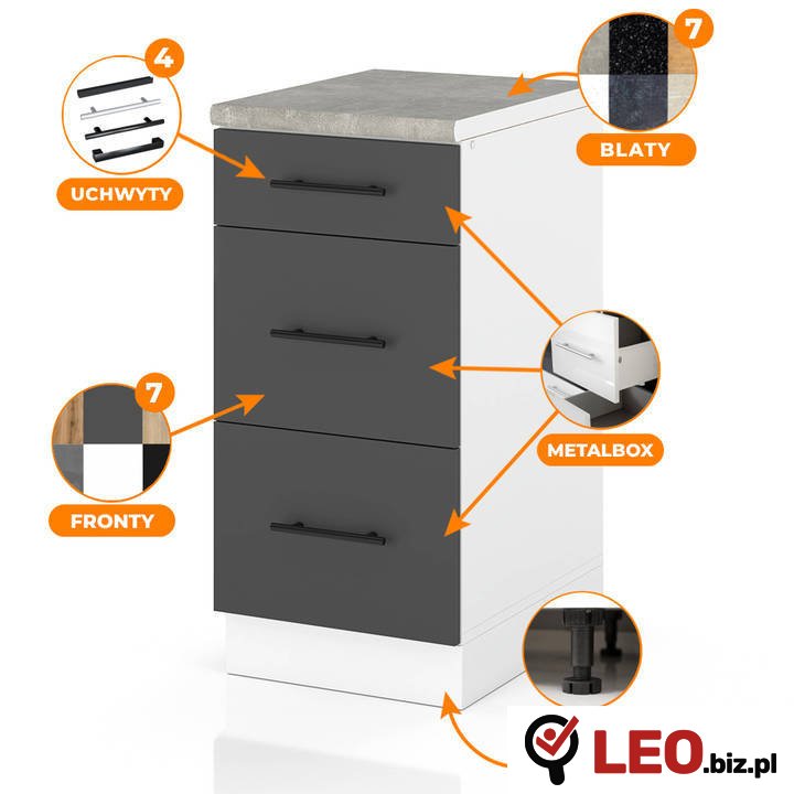 Szafka kuchenna posiada w zestawie 40cm blatu, dostępnego w wielu kolorach do wyboru ( kolory widoczne na zdjęciu produktowym )