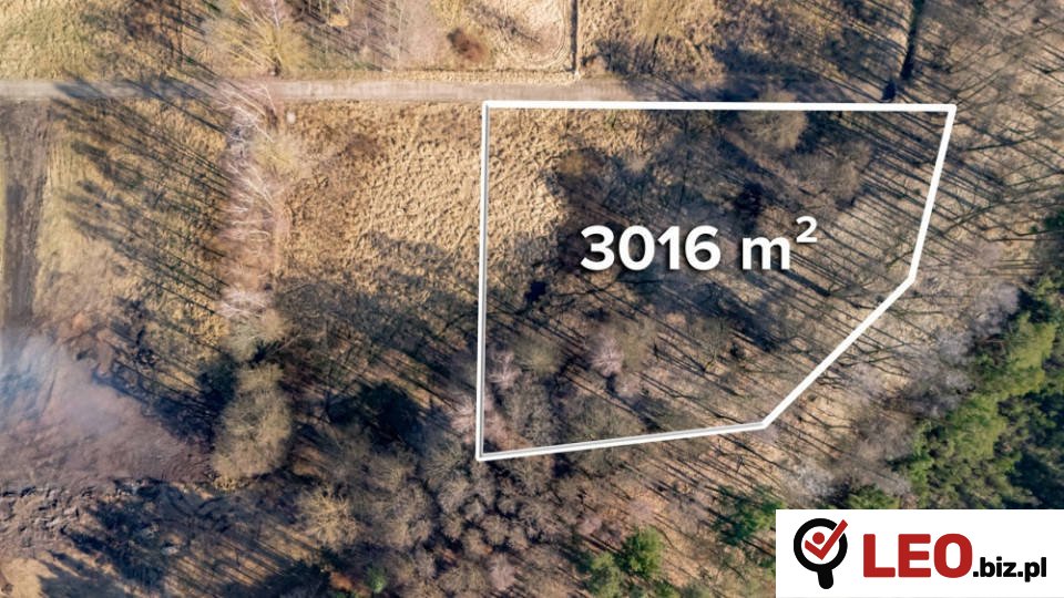 Działka o powierzchni 3016 m2 położona jest w pobliżu lasu, z dojazdem utwardzoną drogą gruntową, która łączy się bezpośrednio z główną drogą asfaltową, odległości około 600m. Kształt działki jest zbliżony do prostokątnego, z dostępem do drogi.